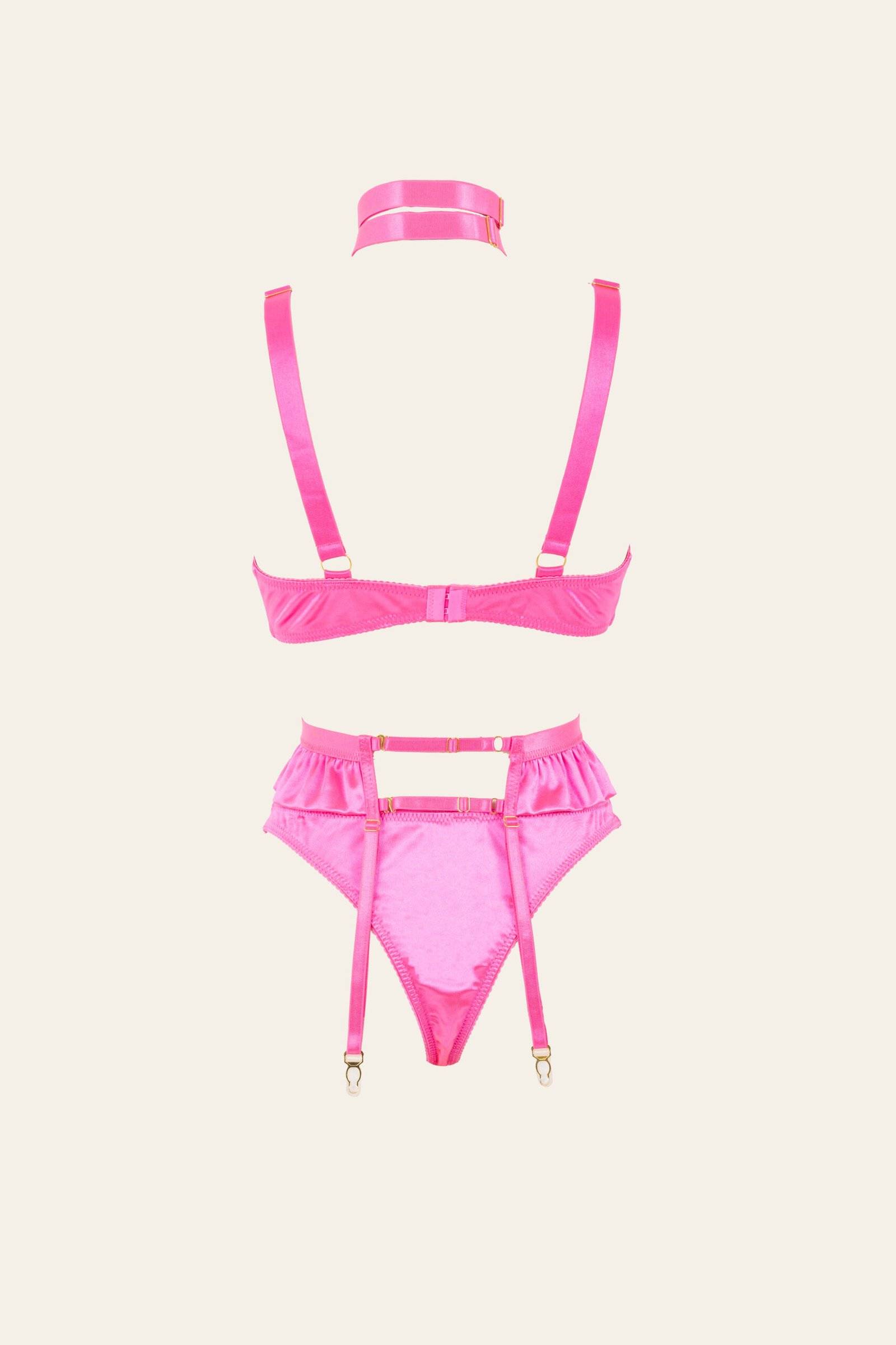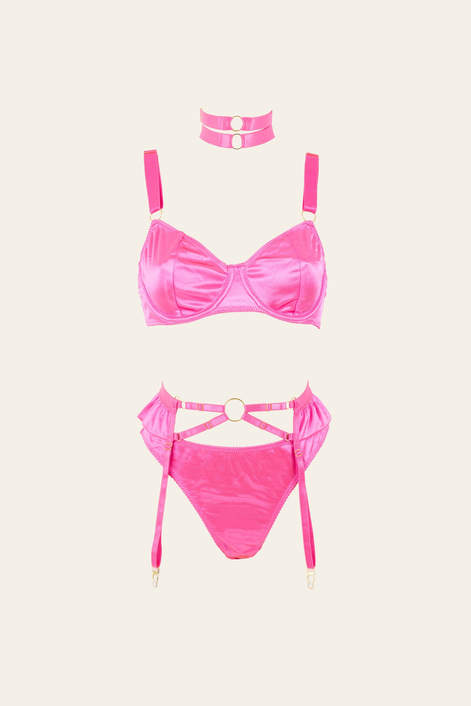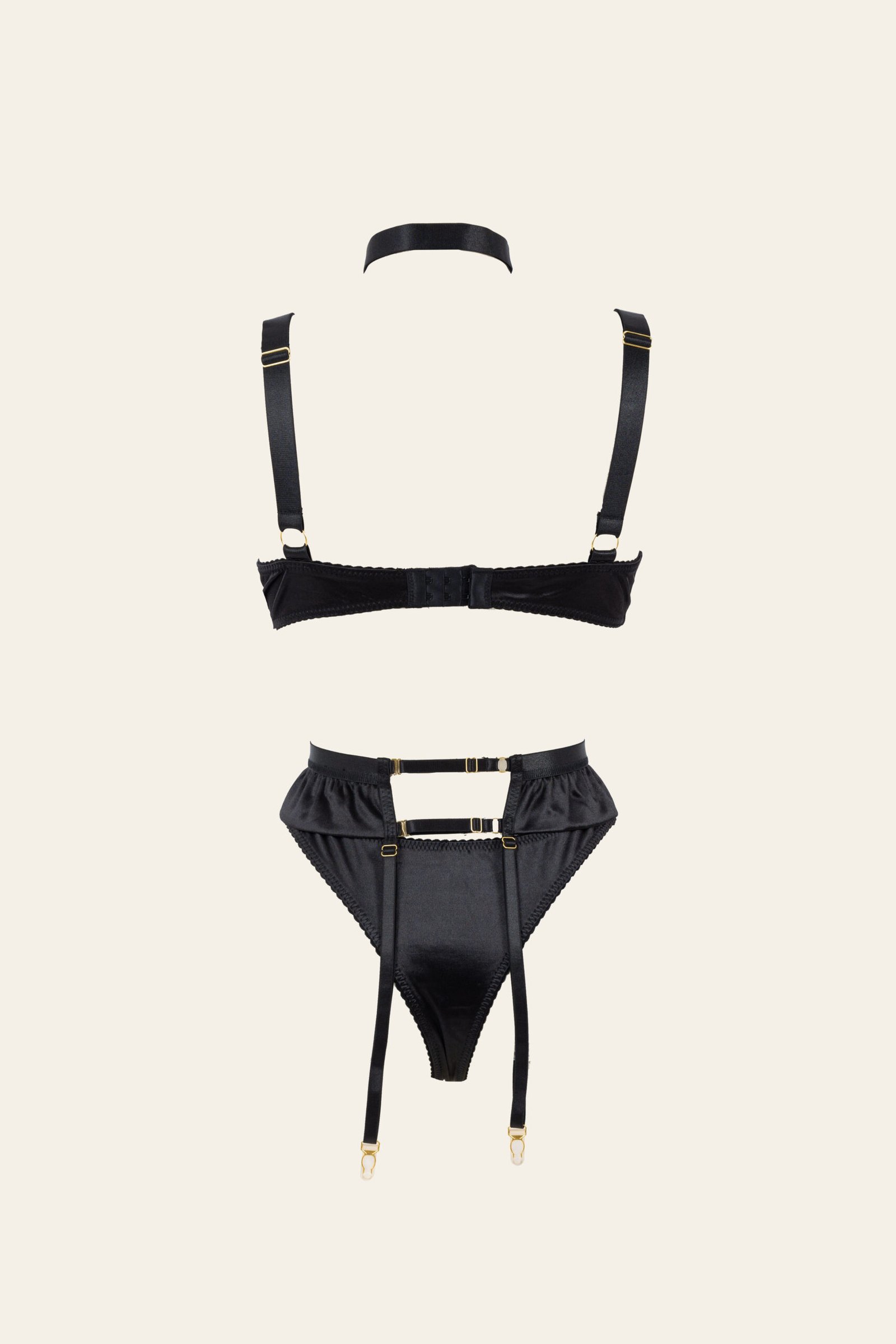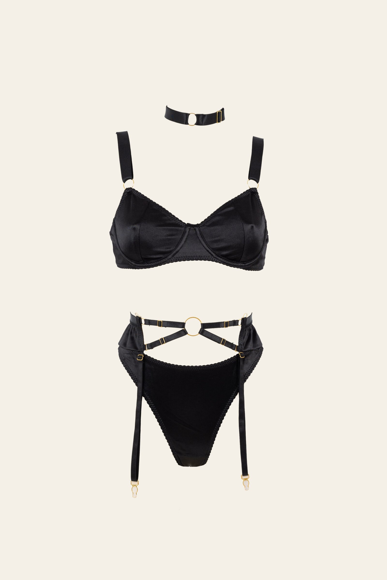 Σετ εσωρούχων string σατέν. Με ζαρτιέρες και choker λαιμού.